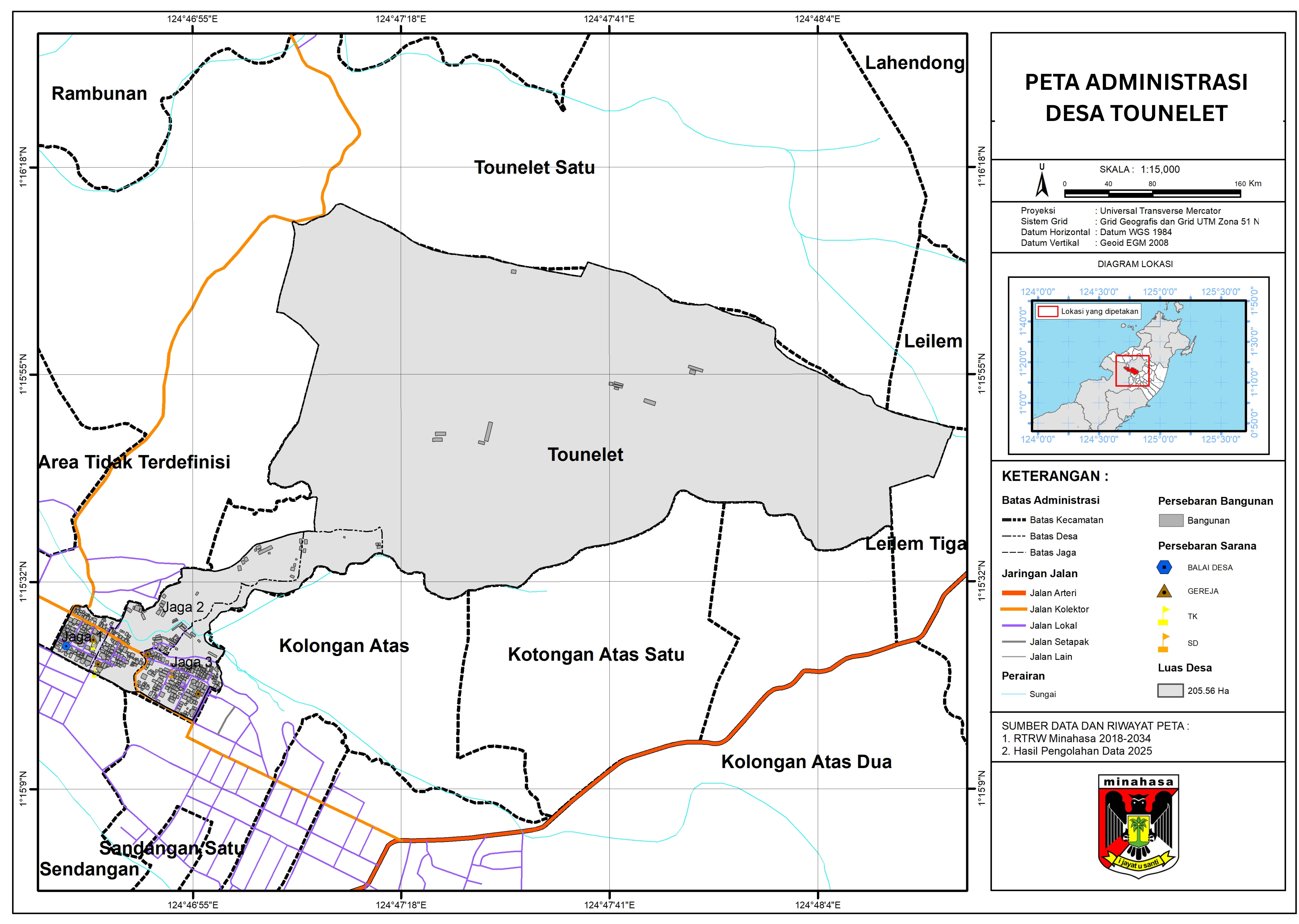 Berikut ini adalah peta administrasi Desa Tounelet yang menunjukkan batas wilayah, pembagian lingkungan, dan titik acuan penting seperti kantor desa, sekolah, dan fasilitas umum.